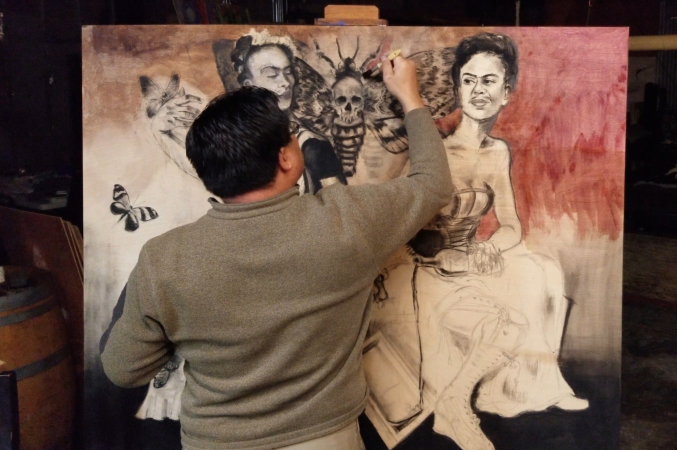 Steven Seizo Nakamura is a California based artist who opened his art studio, “Ancient Vine Studio”, in Long Beach. “Ancient Vines” has come to fruition through a period of growth, struggle, life changes, lack of sleep, and amazing friends. Let the piece “Songs from the Red Violin” excite your imagination and glimpse the complex colors that have evolved from using Red Wine as a medium. Let us take you on a journey through the beauty of pastels and wine.